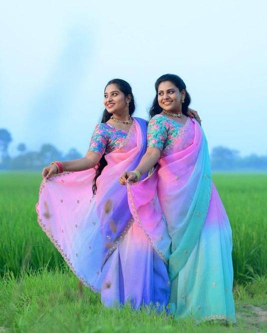 Soft Organza Digital Print Saree With Full Handwork And Border Stitched Silk Blouse