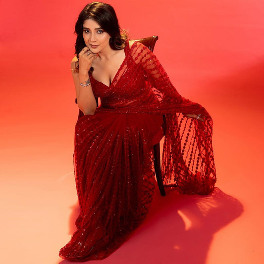 Red Color Bollywood Sequence Heavy Nylon Butterfly Net Saree With Unstitched Blouse