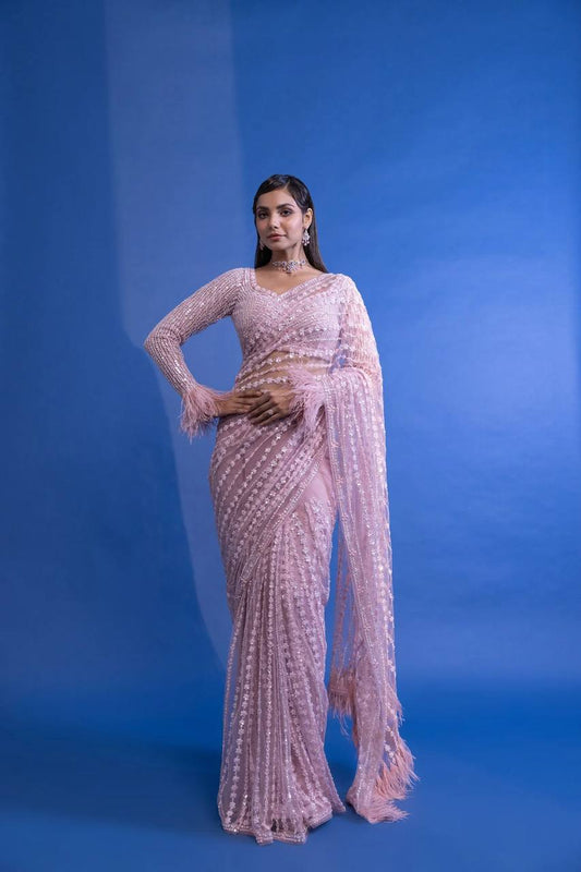Black Color Heavy Nylon Sequined Net Saree With Blouse For Women